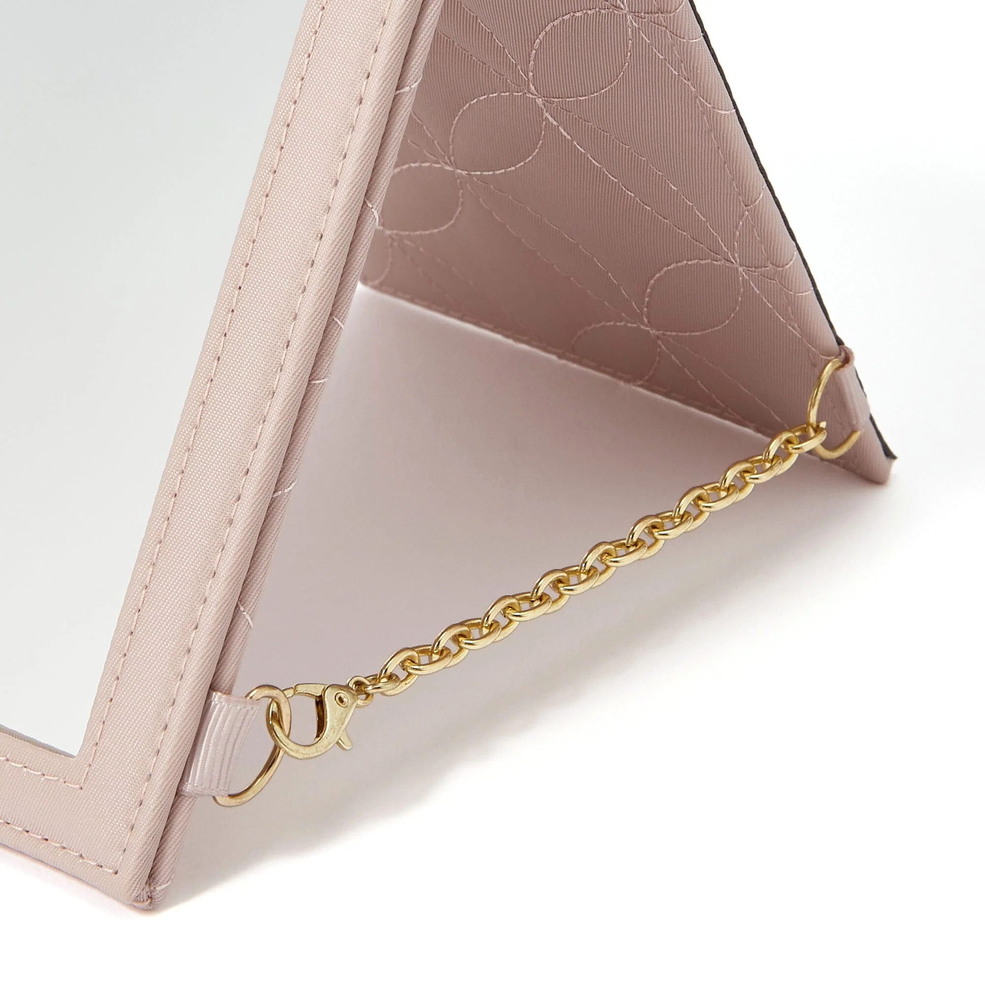 Size: W112×D20×H165mmMaterial: Outer material: Nylon, Lining: Polyester, Mirror: Glass, Chain: Zinc alloy