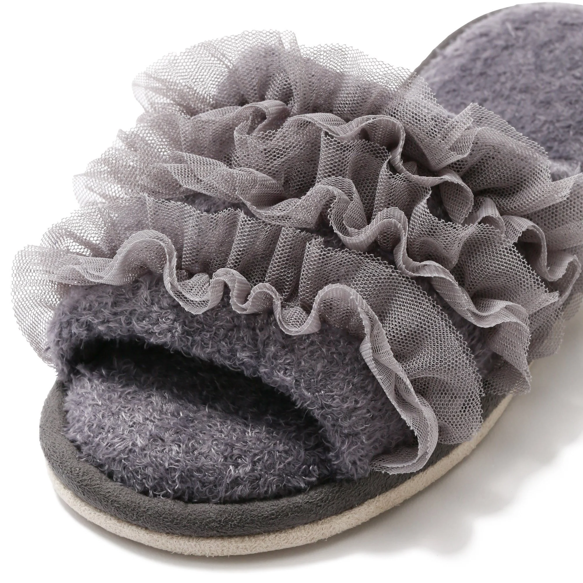Room shoes with a cute design with ruffles of tulle.Nylon knit fabric for relaxing comfort.