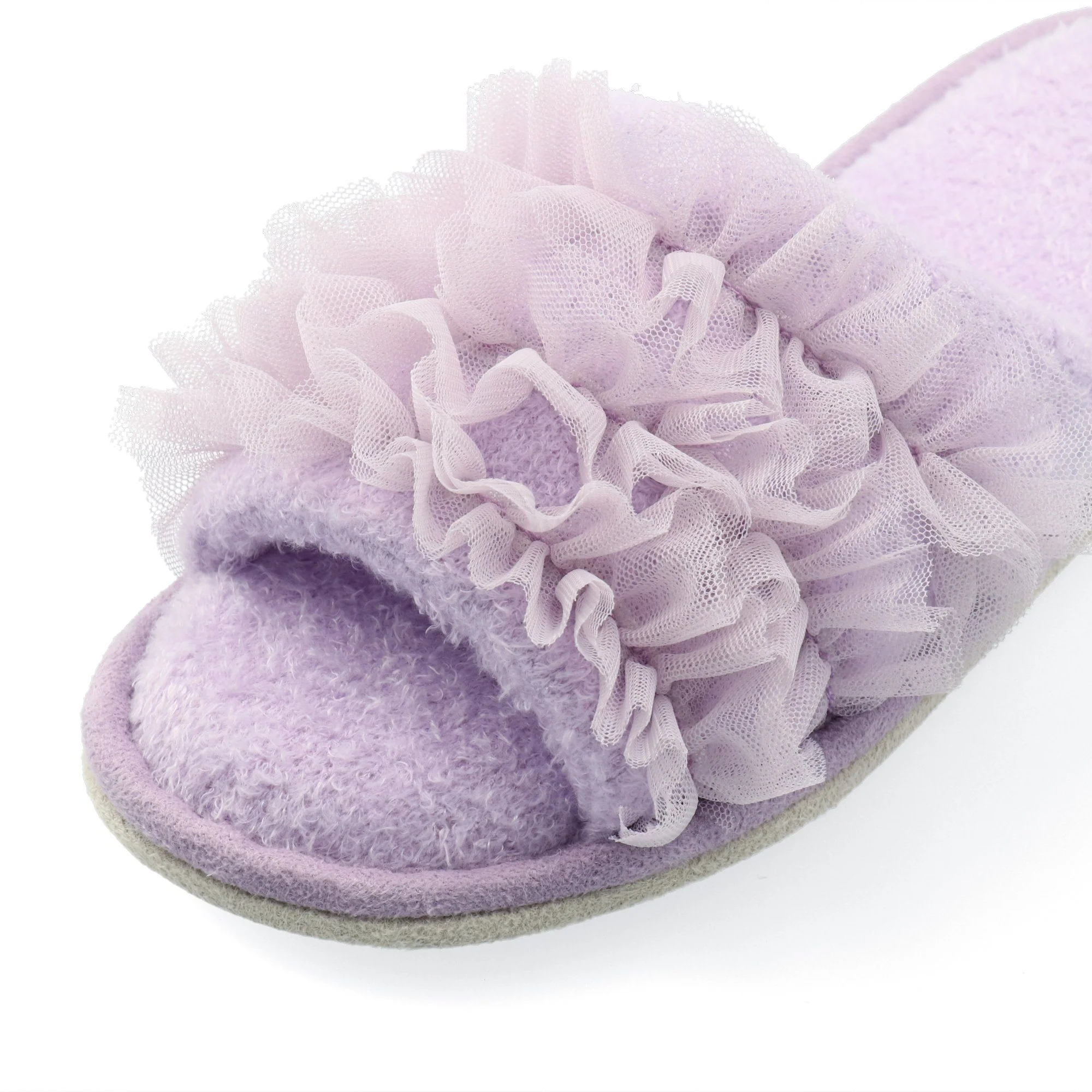 Room shoes with a cute tulle frill design.Nylon knit fabric for relaxing comfort.